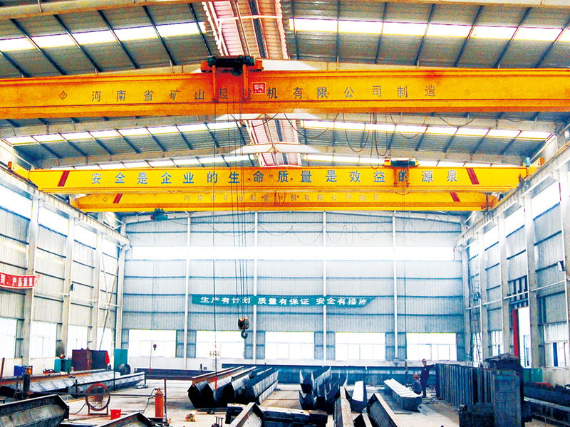 本產(chǎn)品由箱形主梁、端梁、小車及運(yùn)行機(jī)構(gòu)組成,電動(dòng)葫蘆安裝在角型小車上作為起升機(jī)構(gòu),角型小車采用偏掛形式布置在主梁一側(cè)運(yùn)行,小車設(shè)有上、下水平輪,與垂直行走輪呈三點(diǎn)布置。電動(dòng)葫蘆位置由傳統(tǒng)的主梁下提升到主梁上側(cè),有效提高了起升高度。
